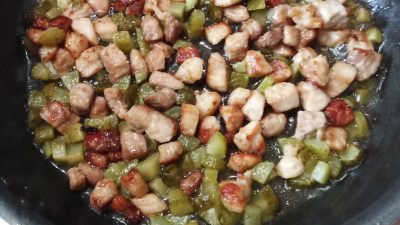 - Добавляем соленые огурцы. Перемешиваем и обжариваем еще минуты 3.