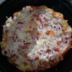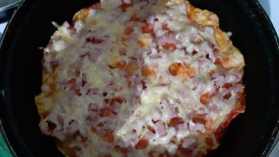 Основа для пиццы по этому рецепту выпекается на сковороде. Потом поверхность смазать кетчупом, разложить начинку и запечь пиццу до готовности.
