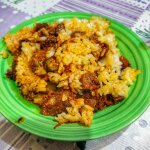 - Отдельно отварить до полуготовности рис, выложить к мясу с подливой, тушить пятнадцать минут.