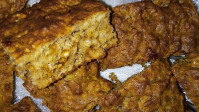 - Из бананов сделать пюре. Немного взбить яйца. Смешать в емкости муку, молотый имбирь и соду. Насыпать овсяные хлопья и все перемешать. Смешать в сотейнике мед с сахаром. Довести до кипения. Сняв с огня, добавить бананы, яйцо и масло. Налить в смесь из муки, перемешать.