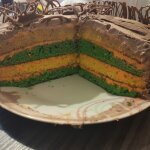 - Все ингредиенты взбить до состояния густой сметаны. Разделить тесто пополам. В одну часть насыпать маленькую ложку какао. Приготовить 2 коржа. Когда они остынут, разрезать их вдоль.