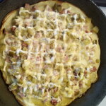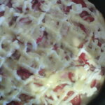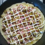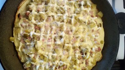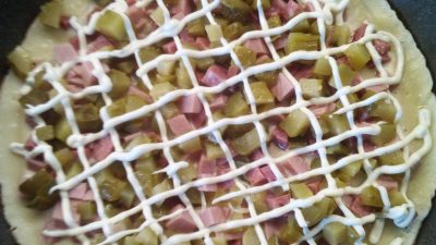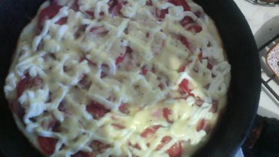 - Для приготовления теста смешать сырое яйцо, просеянную пшеничную муку, сметану и майонез в равных пропорциях. Тесто должно получиться полужидким. Вылить массу на смазанную сковороду среднего размера, выложить порезанные сосиски, соломку копченой колбасы, немного прожаренные грибы.