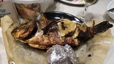 - Зубчики чеснока очистить, разрезать пополам и немного обжарить на оливковом масле. Морского карася посолить, натереть сухими травами – орегано, тимьяном, шалфеем, базиликом и майораном, оливковым маслом. Смесь черного, розового и зеленого перца – по вкусу. С одной стороны тушки сделать глубокие поперечные надрезы, вложить тонкие дольки лимона. Внутрь рыбы – свежий розмарин и обжаренный чеснок.