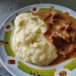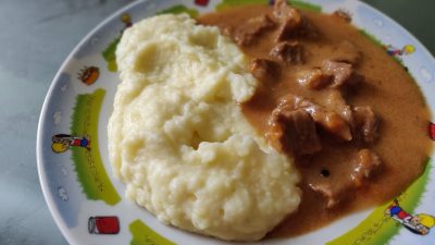 - Смешать чайную ложку томатной пасты, столовую муки с теплой водой (0,5 стакана), добавить столовую ложку сметаны, хорошо все перемешать, чтобы разбить все комочки. Вылить тонкой струйкой в мясо, постоянно помешивая, тушить еще 10 минут все вместе. Сварить картофель, размять до состояния пюре, влить подогретое подсоленное молоко, перемешать. Подавать гуляш из говядины с пюре и подливой в горячем виде.
