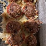 - Прикрыть кружочком помидора, сверху положить маленькую ложку фарша. Присыпать тертым сыром и поставить запекаться при 180–200 градусах, на 30 минут. Готовый картофель, запеченный с мясом и помидорами, украсить щепоткой зелени.