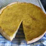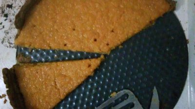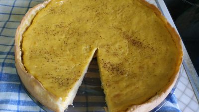 - Начинка должна быть жидкой, вылить ее в приготовленную форму с тестом, печь тыквенный пирог в духовке в течение 30–40 минут, до готовности, поверить ножом или зубочисткой.