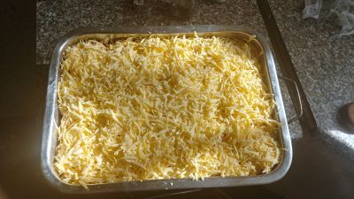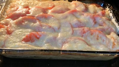 Желательно установить форму на нижнюю полку, для того, чтобы верх сильно не зажаривался. По истечении этого времени присыпаем сыром сиртаки, а сверху смешанными сулугуни и российским. И отправляем в духовку на 10-15 минут.