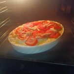 После раскладываем помидоры, смазываем их майонезом, и отправляем в заранее разогретую до 200° духовку на 1ч 30м.