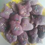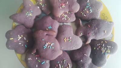 - Противень застелить бумагой, выложить лиловое печенье и поставить выпекать в духовку на 15 минут при температуре 180 градусов.