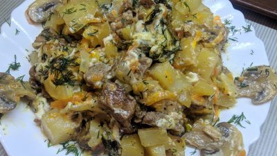 Мясо в горшочке с шампиньонами и сыром