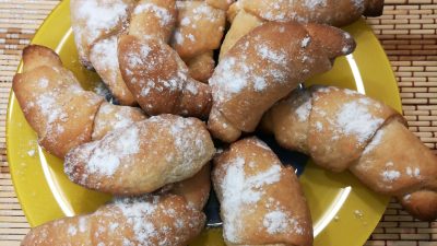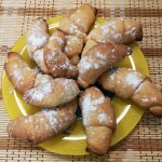 - Когда тесто остынет, достать и разделить на 4 части. Раскатать 4 пласта толщиной 2 миллиметра. Посыпать корицей и сахаром. Порезать каждый круг на 8 секторов, сформировать рогалики. Положить на противень. Отправить в духовку, готовить до золотистого цвета, соблюдать температуру 180 градусов. Посыпать вкусные синнабоны сахарной пудрой.