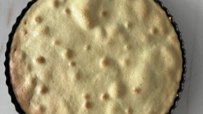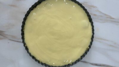 - Переложить тесто в форму, сформовать бортики, уложить банан, вылить сверху яичную смесь.