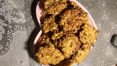 Готовила печенье на 2 порции, печенье получилось не такое как на фото в этом рецепте выложено, в ингредиентах не написан изюм, положила немного изюма 10 гр, надо было грамм 40 положить, тогда бы печенье было более вкусное. Не хватает вкуса изюма, Так как печенье без сахара, то оно пресное получилось. Вкус печенью немного придает яблоки и изюм конечно. Поэтому рекомендую на 1 порцию печенья грамм 25 гр изюма.