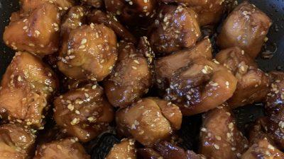 - Прогреть до однородного состояния. Выложить грудки, жарить на медленном огне до золотистой корочки со всех сторон. В конце жарки куриные грудки по-восточному посыпать семечками кунжута, перемешать, еще немного прогреть и снять с огня.