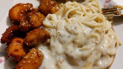 Получилось очень быстро и вкусно, добавить ещё овощей и почти как поке с курицей)))