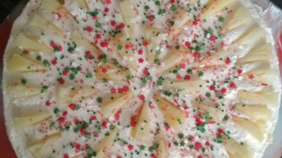 - Верх торта «Ананасовый» также украсить нарезанными ананасами, покрыть кремом, намазать бока.