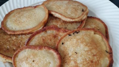 - Получившееся тесто выложить на горячую сковородку с маслом и жарить банановые оладьи со всех сторон, пока они не станут коричневого цвета. Разложить готовые банановые оладьи на молоке по тарелкам и украсить кружочками бананов.