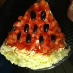 - На арбузную дольку выложить куски помидора вверх мякотью, так, чтобы он покрыл весь салат, и не осталось светлых промежутков. Сделать белую полосу из тертого сыра, зеленую полоску из огурца, как корку арбуза. Выложить на салат «Арбуз» из маслин арбузные косточки.