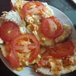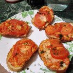 - Выложить на ломти полученную массу толстым слоем, прикрыть кружочками помидора.
