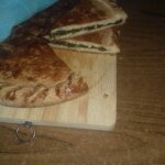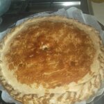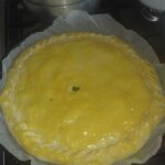 - Половину теста раскатать, выложить в форму, сверху посыпать крахмалом и выложить начинку.
