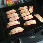 - Надрезать вдоль сардельки или сосиски, положить в надрез чесночную массу. Намазать майонезом, посыпать сыром.